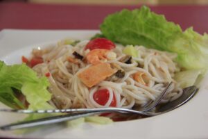 Do tajskiego jedzenia pasuje makaron. Sos tajski idealnie zgrywa się z makaronem ryżowym, dalatego warto schab podawać właśnie z tym produktem.